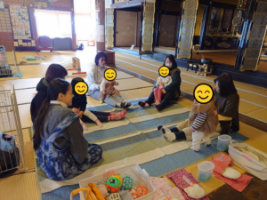 如意寺では、お寺での活動を「仏活」と呼んでいます。入寺した頃、前住職から「自坊の法要にお参りに来てくださる方が減ってきた」と聞き、子育てしながら私が出来る仏さまのお手伝いをしようと思いました。まず息子の入園を機に毎月1回「寺報」の作成を始めました。ご門徒さん宅一軒一軒に手配りし(遠方は郵送)、会話する中で、門徒さんの興味のある事をヒントに「仏活」を始めました。仏活は、合掌で始まり合掌で終わります。仏活に参加された方々は、開山忌・祠堂法要・報恩講のお参りや法要のお勝手やお華束作りを楽しみながら参加してくださいます。